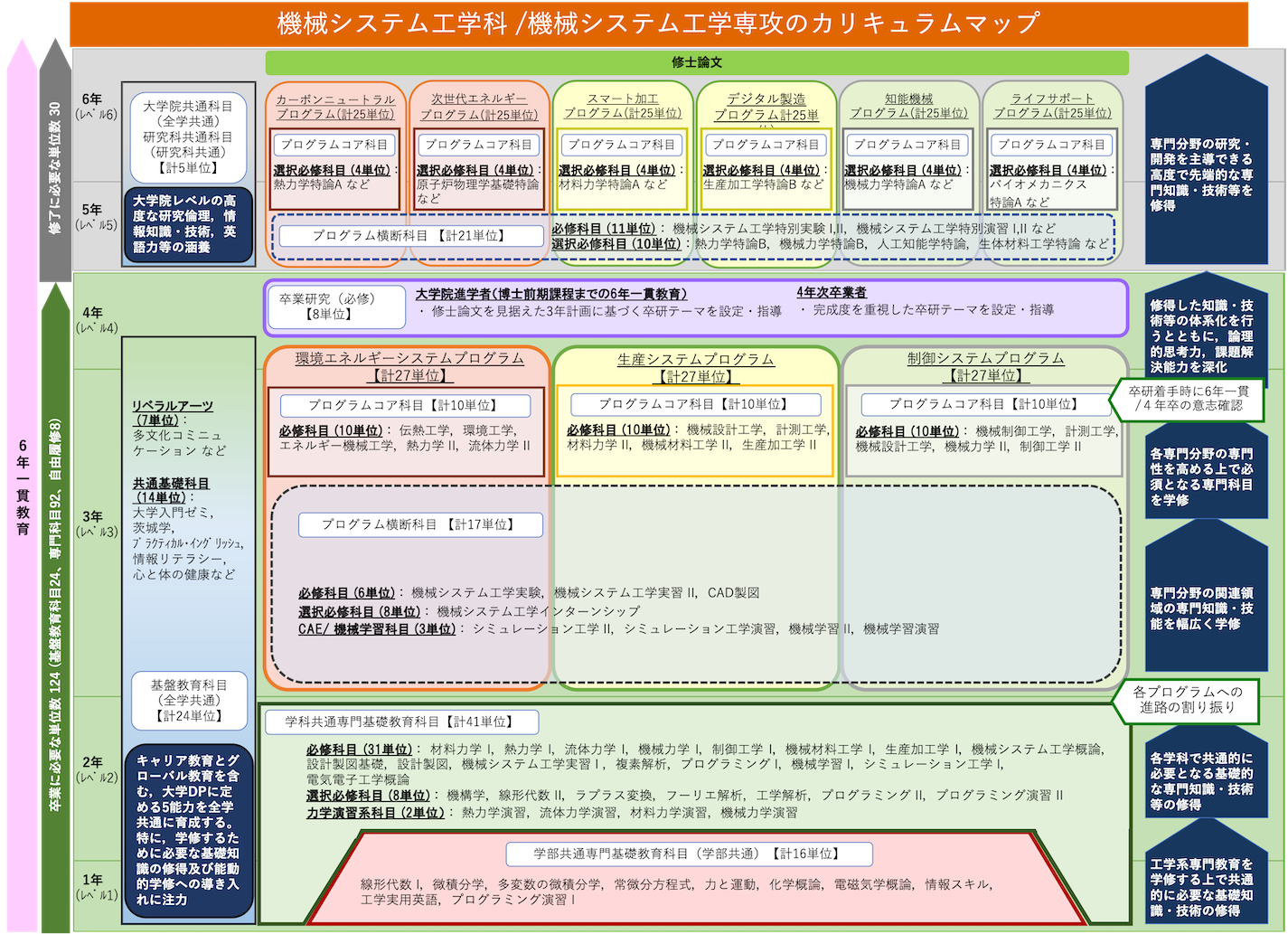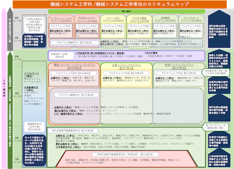 高度専門科目であるエネルギー機械、設計製造、情報機械プログラム別専門科目と実験科目や演習科目であるプログラム横断科目を学修、機械システム工学の高度な専門知識とその応用力を養います。