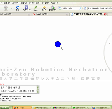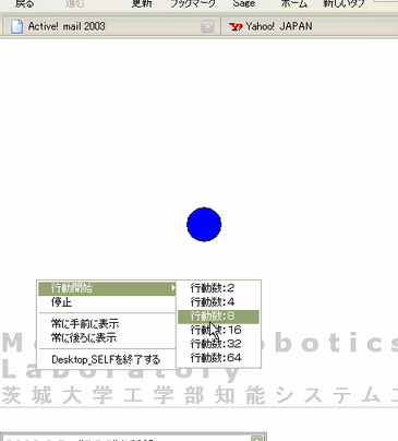 このプログラムは,コンパニオンロボットSELFの研究で使用しているシミュレーションに登場するSELF(青ボール)をデスクトップマスコットにしたものです. マウスカーソルを追いかける,逃げる,くるくる回るなど,多種多様な動きをします. メニューから行動パターンを切り替えることが出来ます.